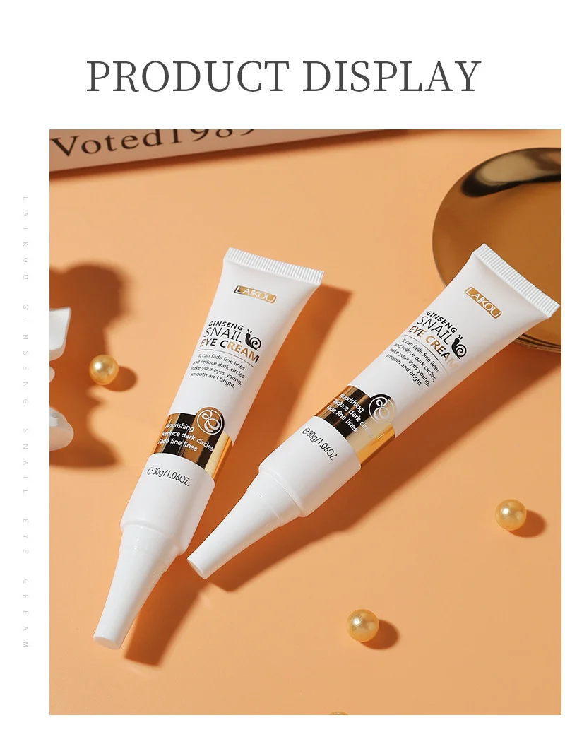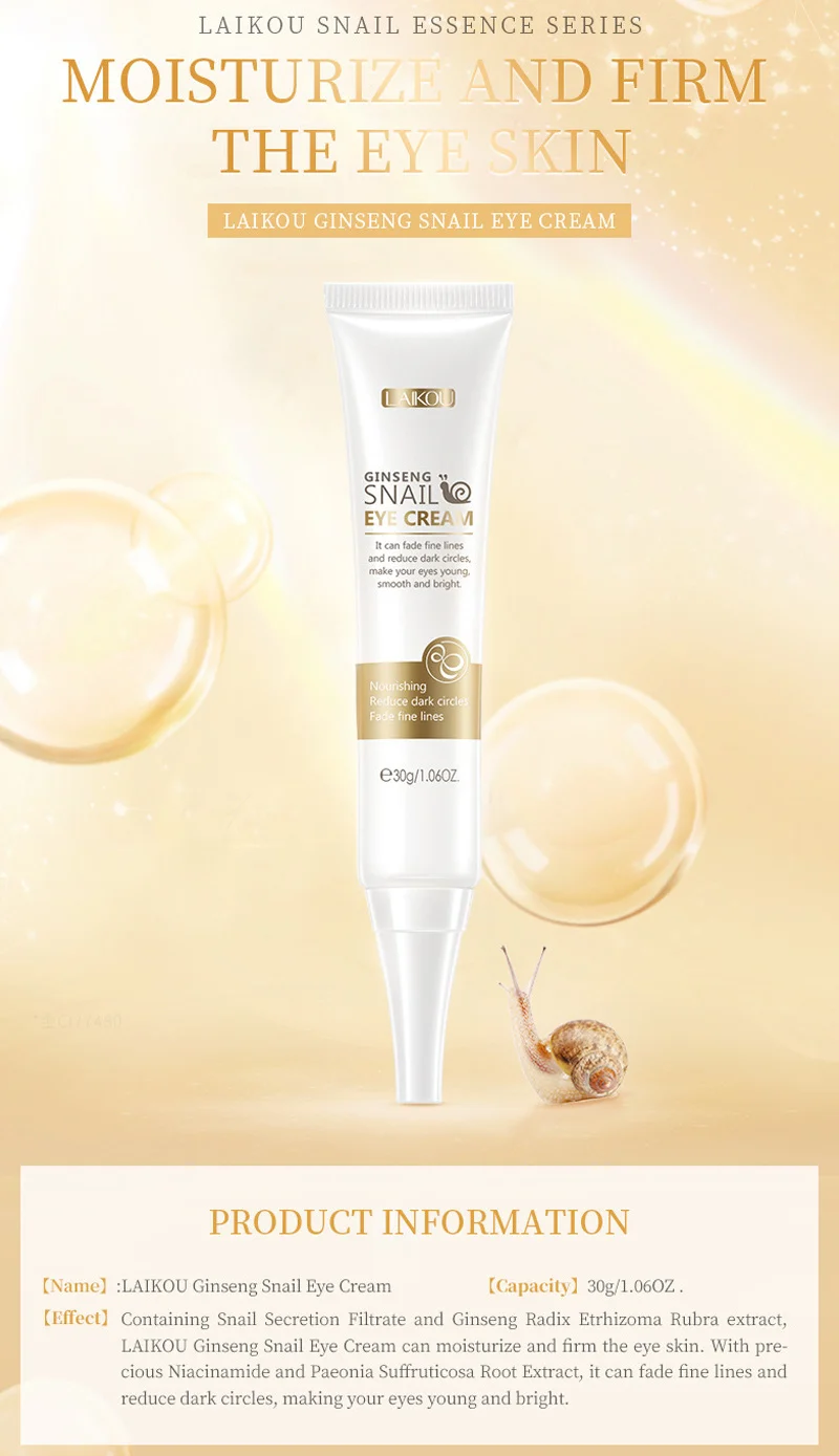 [Name]: LAIKOU Ginseng Snail Eye Cream [Capacity]: 30g/1.06OZ. [Effect]: Containing Snail Secretion Filtrate and Ginseng Radix Etrhizoma Rubra extract, LAIKOU Ginseng Snail Eye Cream can moisturize and firm the eye skin. With precious Niacinamide and Paeonia Suffruticosa Root Extract, it can fade fine lines and reduce dark circles, making your eyes young and bright.