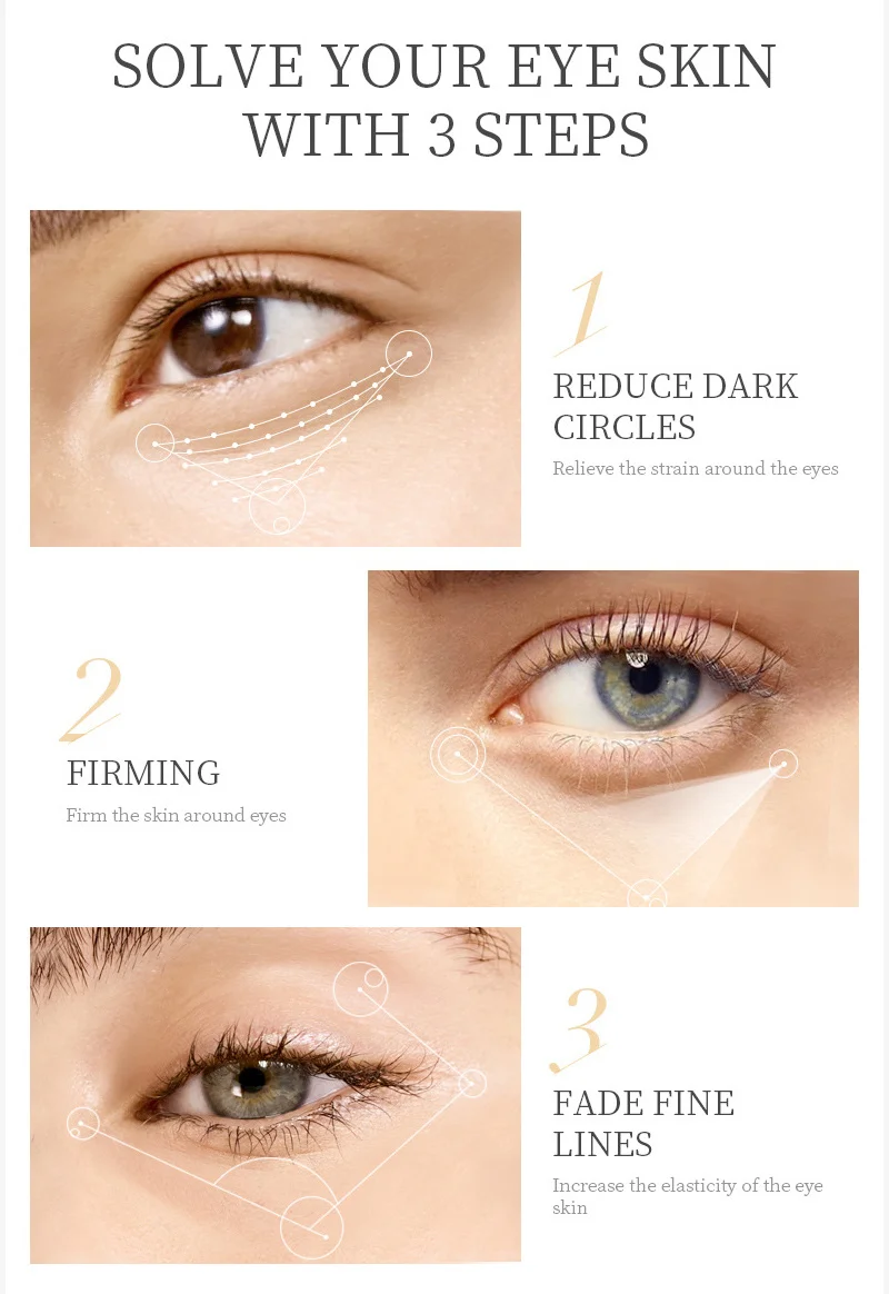 1. REDUCE DARK CIRCLES - Relieve the strain around the eyes 2. FIRMING - Firm the skin around eyes 3. FADE FINE LINES - Increase the elasticity of the eye skin
