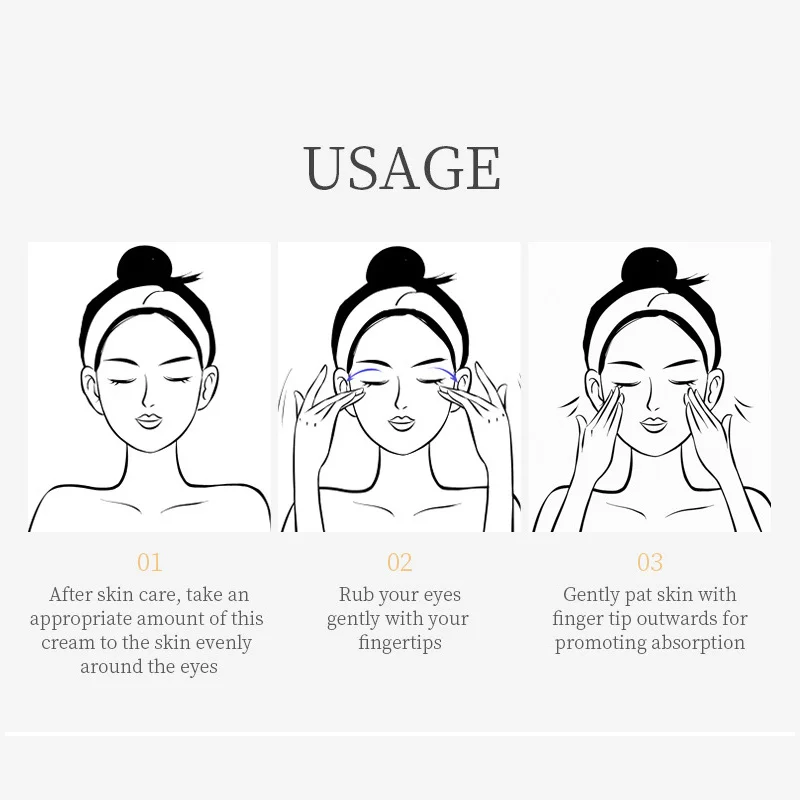 ▶ USAGE 1. After skin care, take an appropriate amount of this cream to the skin evenly around the eyes; 2. Rub your eyes gently with your fingertips; 3. Gently pat skin with finger tip outwards for promoting absorption.