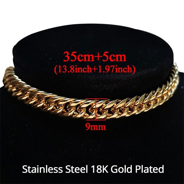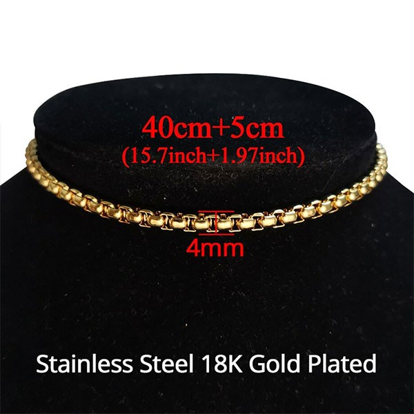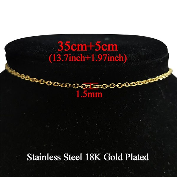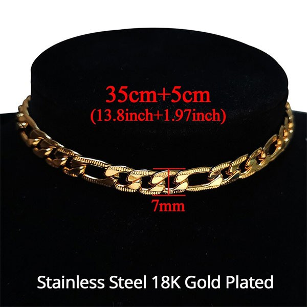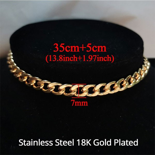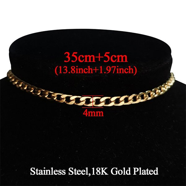 This is stainless steel , not alloy!Chain Style:Gold Choker ChainMaterial:Stainless Steel 18K Gold PlatedChain Length:35cm+5cm and 40cm+5cmSize:As picture, chain wide from 1mm-12mm