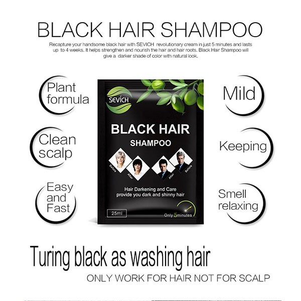 Product Brand: Sevich Product Name: Black Hair Shampoo Applicable: adult, teen, child, grey and white hair Net Weight: 25ml Efficacy: Black Hair Shampoo make white and grey hair become black immediately, does not color the scalp, always clear water, easy to use