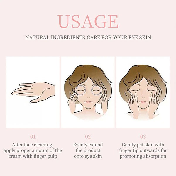 NATURAL INGREDIENTS-CARE FOR YOUR EYE SKIN 01After face cleaning,apply proper amount of the cream with finger pulp 02Evenly extend the product onto eye skin 03gently pat skin with finger tip outwards for promoting absorption