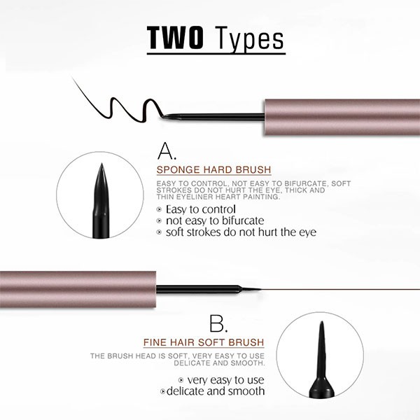 This waterproof liquid eyeliner creates thin or thick defined lines that won't smudge or run. Two kinds of brush tip easily draws on eyeliner for long wear color.
